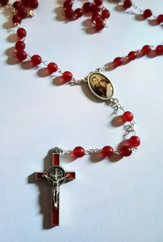 Richiedi in Parrocchia. Corona del Santo Rosario con medaglietta fronte retro di San Camilla e di Maria Salute degli Infermi. Cristallo opaco e sfondo rosso della Croce