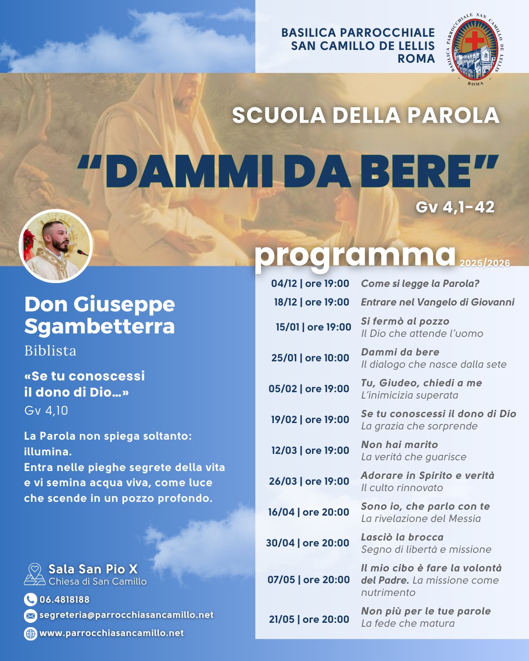 Il tema di quest’anno, “DAMMI DA BERE” è in sintonia con il programma pastorale 2025-2026 della Diocesi di Roma. Che questo viaggio nella Scrittura possa colmare la nostra sete di Dio!