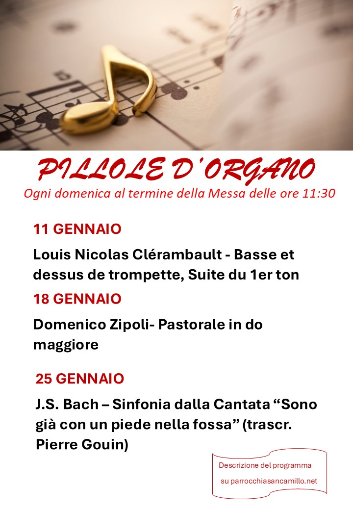 Ogni Domenica, al termine della Messa delle 11:30, l’esecuzione di un brano (2/3 minuti) tra i più grandi musicisti della storia della musica classica. Un’occasione per godere delle sonorità del nostro magnifico organo e per conoscere i GRANDI della musica.